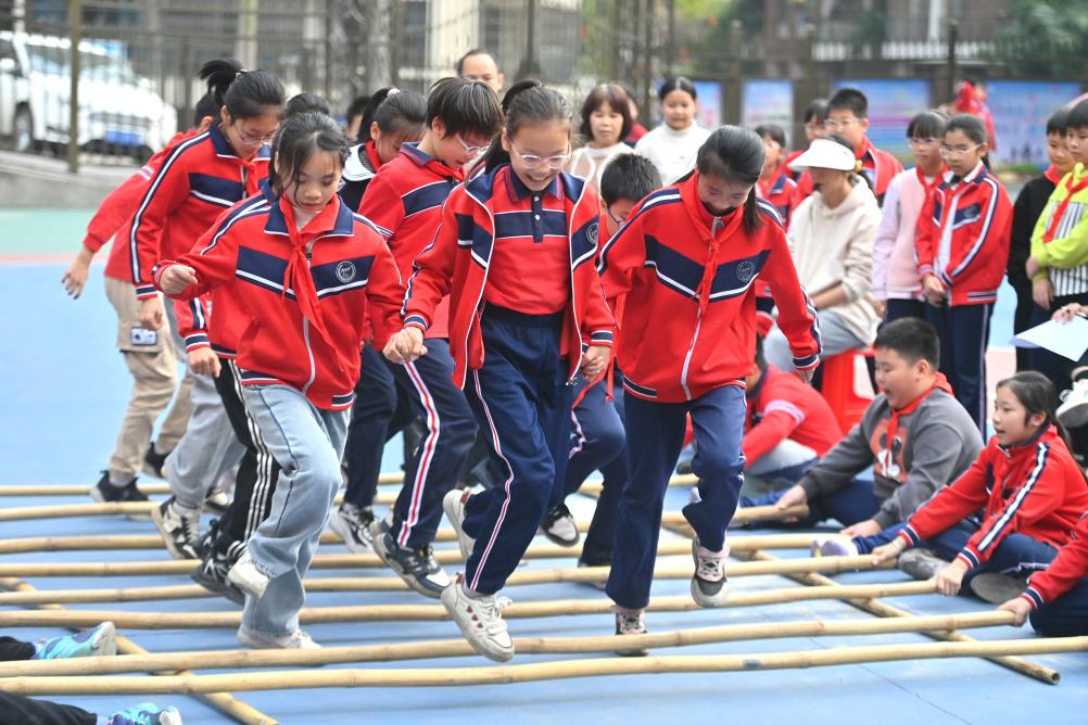 梧州市新兴二路小学的学生们在体验竹竿舞项目(2024年12月6日摄)。