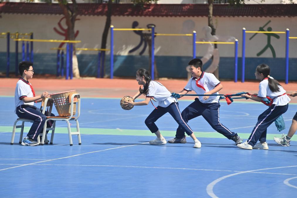 梧州市新兴小学学生在大课间打竹球(2025年5月13日摄)。