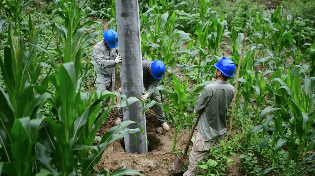在宣恩县沙道沟镇,供电抢修人员连续奋战6小时,开展立电杆、接线等工作,确保受灾地区民生用电。