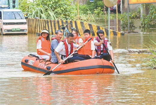 6月22日,受持续强降雨影响,河池市金城江城区发生内涝,当地干部群众全力抢险保平安。图为河池海事局救援人员在该城区老街村转移被困群众。陈林/摄
