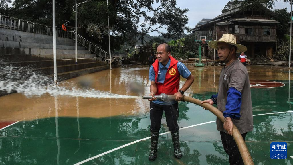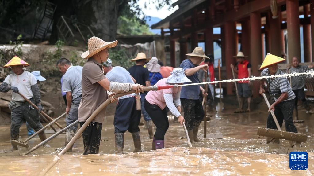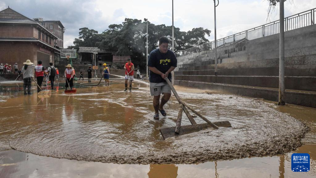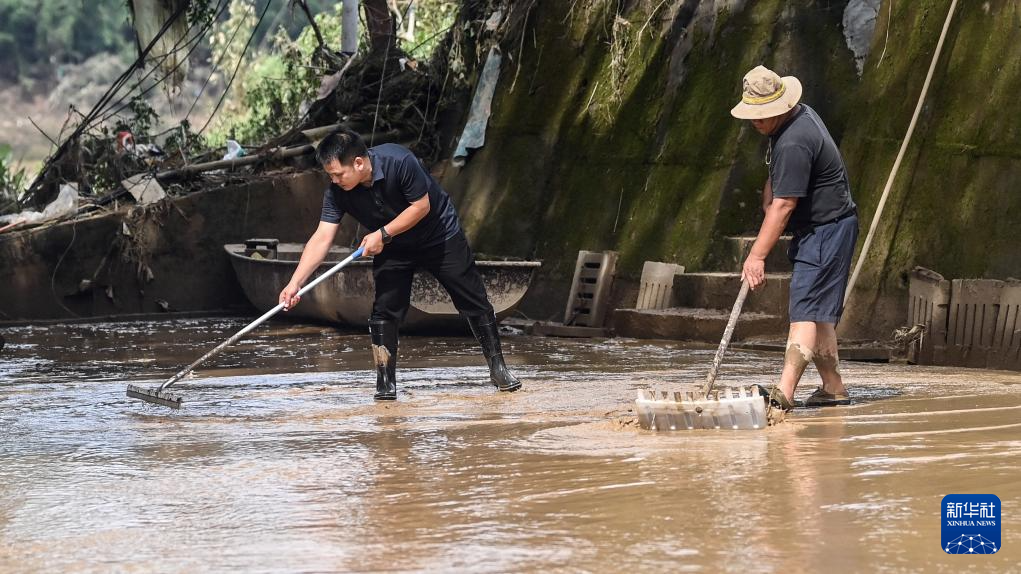6月26日,人们在三江侗族自治县良口乡良口村清理淤泥。