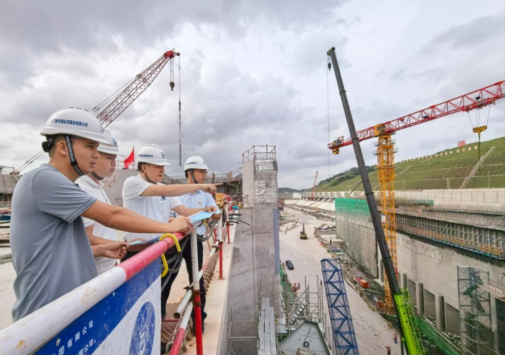 在广西平陆运河青年枢纽,潘剑(右二)和团队成员正在巡查施工现场。新华社记者 杨驰 摄