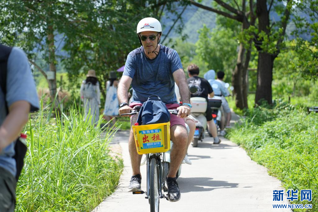7月3日,在广西桂林市阳朔县,外国游客在骑自行车游览。新华社记者 张枫 摄