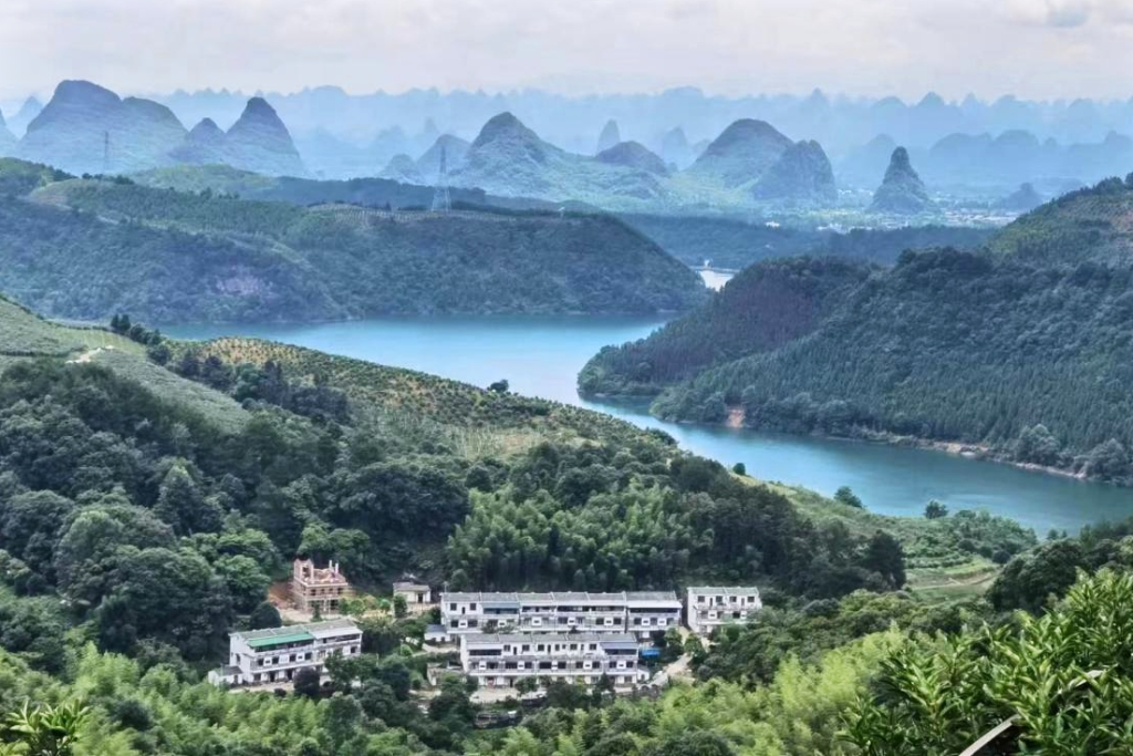 这片挂满青果的果园,正是马蹄桥村移民生活“蝶变”的见证。马蹄桥水库移民新村位于桂林市临桂区南边山镇,22户青瓦白墙的桂北民居错落有致地掩映在山林间。村头一座古朴的凉亭上,“逢友多聊称心事,向人莫唱得意歌”的楹联,为这个小村平添了几分文化底蕴。
