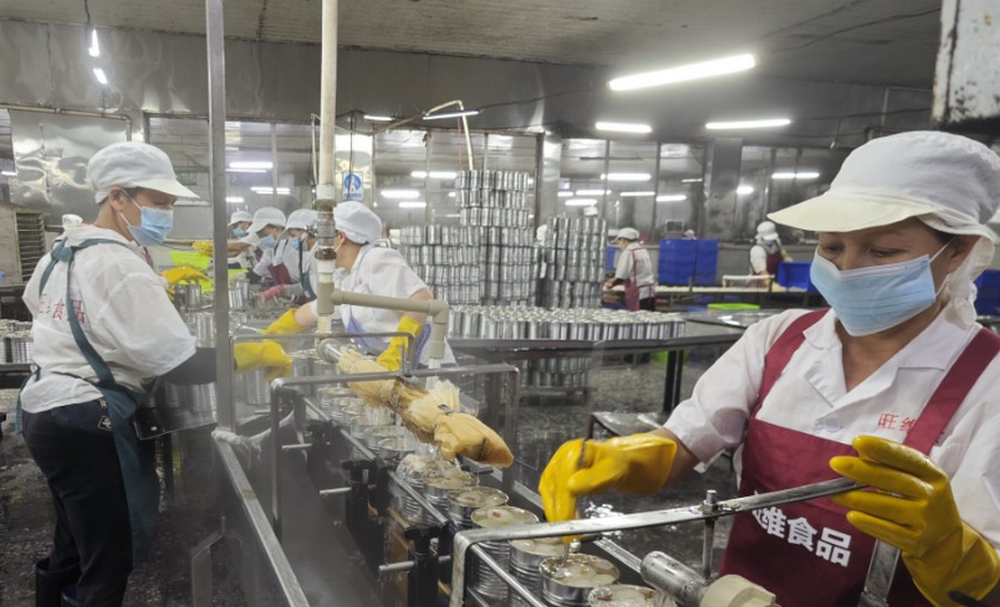 在自治区政府技术改造扶持与径口镇每月“服务进企业”活动助力下,旺维食品公司推进“水果罐头”出国门标准化建设。目前,该公司拥有3条罐头生产线,主打菠萝罐头、荔枝罐头、龙眼罐头等热带水果罐头及速冻果蔬、干果,年产量超1.5万吨。