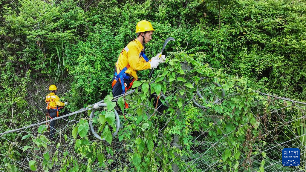 桥隧工人清除被动网上的藤蔓和杂草(7月15日摄,无人机照片)。