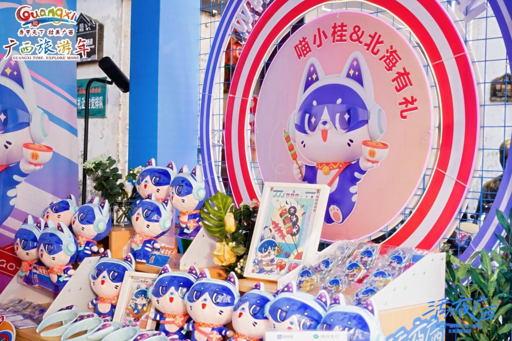 在北海老街的一家快闪店门头上,印着各种造型的“喵小桂”形象,门口还有“喵小桂”人偶与游客互动。店内有联名冰饮,还有装满“喵小桂”毛绒玩偶的抓娃娃机、抽奖赢大礼等互动,快闪店成为了活动当晚整条街最热闹的打卡点之一。