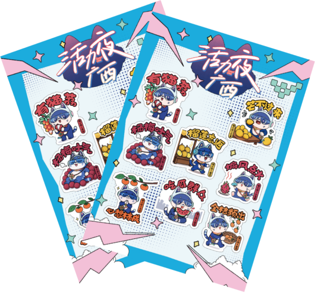 “喵小桂”广西水果联名贴纸以荔枝、芒果、榴莲等8种广西特色水果为基础,巧妙融入当下年轻人聚焦的情绪价值反馈,设计了8款独特的“‘喵小桂’+广西水果形象”。