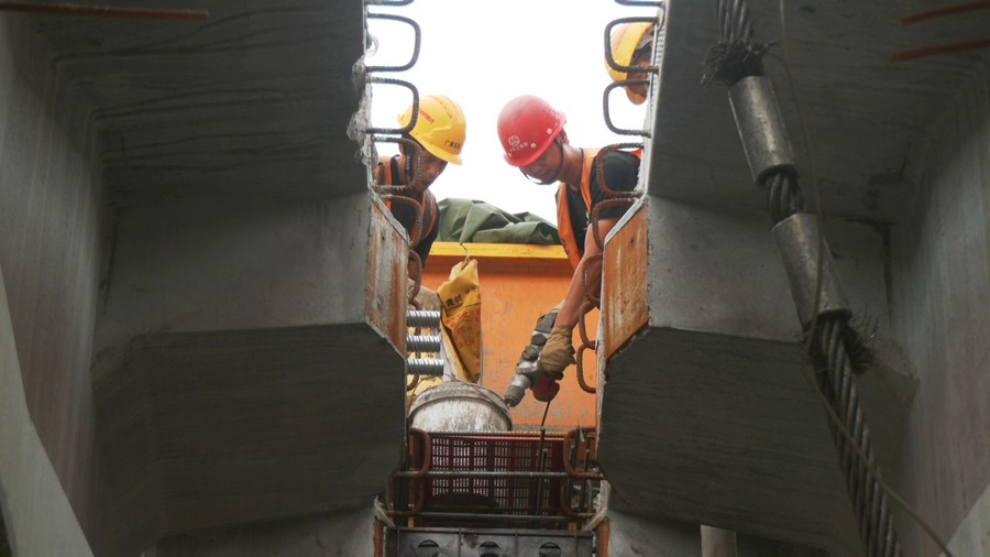 柳梧铁路4标项目标段正线长度21.421公里,包含桥梁3座,需预制和架设T梁2124片。本次架设的金田紫荆河特大桥最后一片T梁位于0号桥台至1号墩之间,梁长32.6米,梁重125.1吨。为确保架梁任务高效推进,项目部科学统筹资源配置,优化架梁施工组织,确保了T梁架设任务按预期完成。