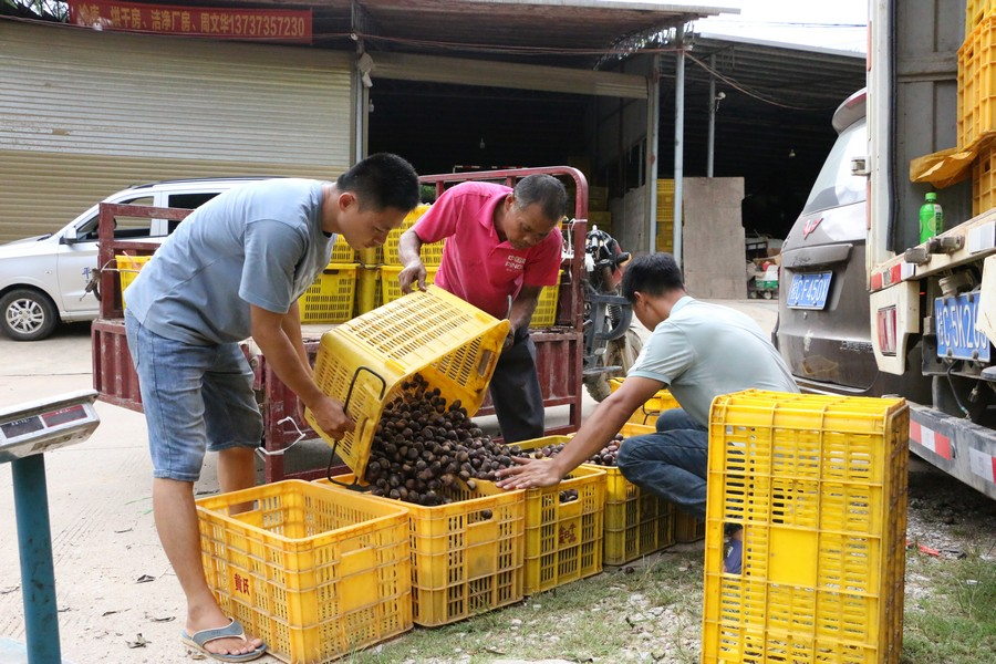 栗农正在对板栗进行过称打包装箱发车。莫斌 摄