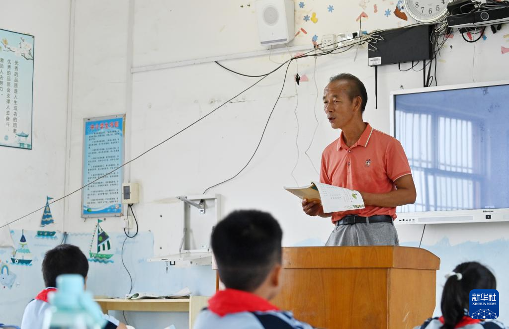 这个学期,年过60岁的王英红老师主动向当地教育主管部门提出申请,又回到讲台上继续给学生上课。现在,七新教学点有小学一二年级共15名学生,王老师担任二年级班主任,上二年级语文课和一年级数学课,还兼任两个年级的音乐课和体育课。