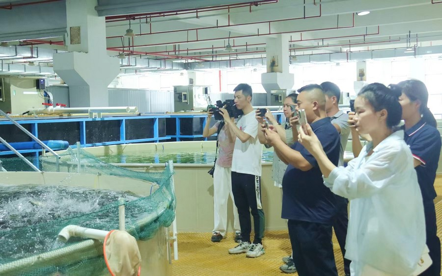 在广西南科重工机械有限公司厂房,机器运转的轰鸣声铿锵有力,采风团了解设备研发历程、核心技术及应用场景;在广西华芯数智科技有限公司现代循环水渔业养殖基地,AI智能养殖技术成果直观展现。