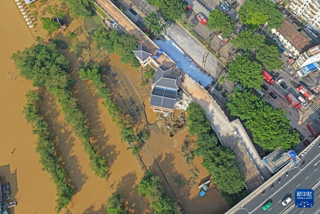10月12日拍摄的广西南宁市北大桥右侧堤外停车场二坑泵站路面塌陷区(无人机照片)。该区域险情已基本解除。