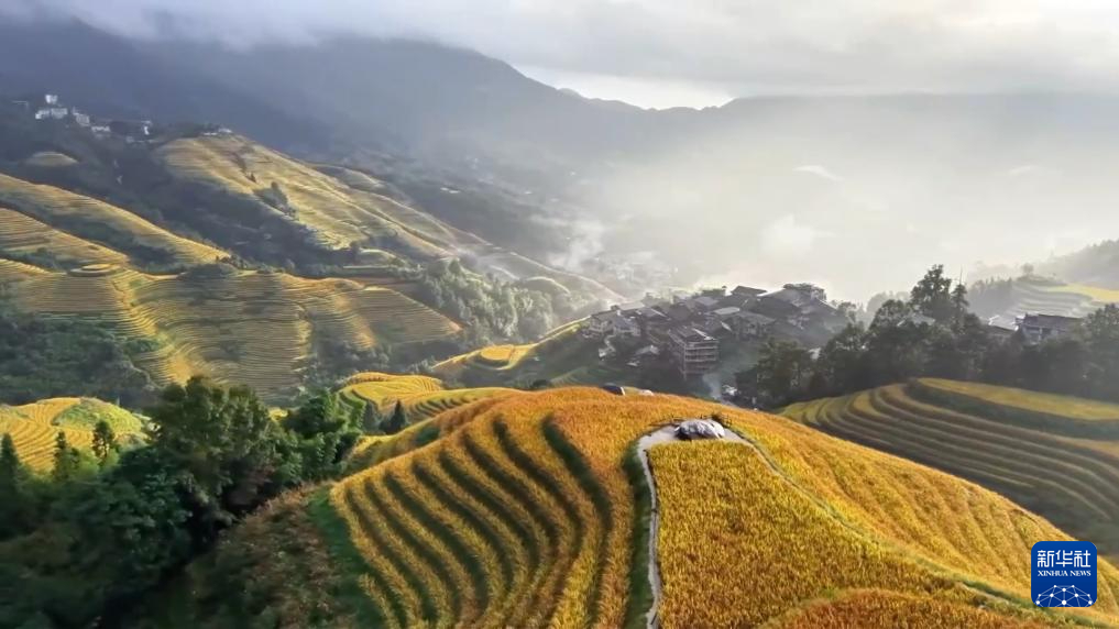 一场秋雨过后,广西龙胜各族自治县龙脊梯田云雾缭绕,云海、梯田、吊脚楼构成一幅幅美丽的田园画卷。