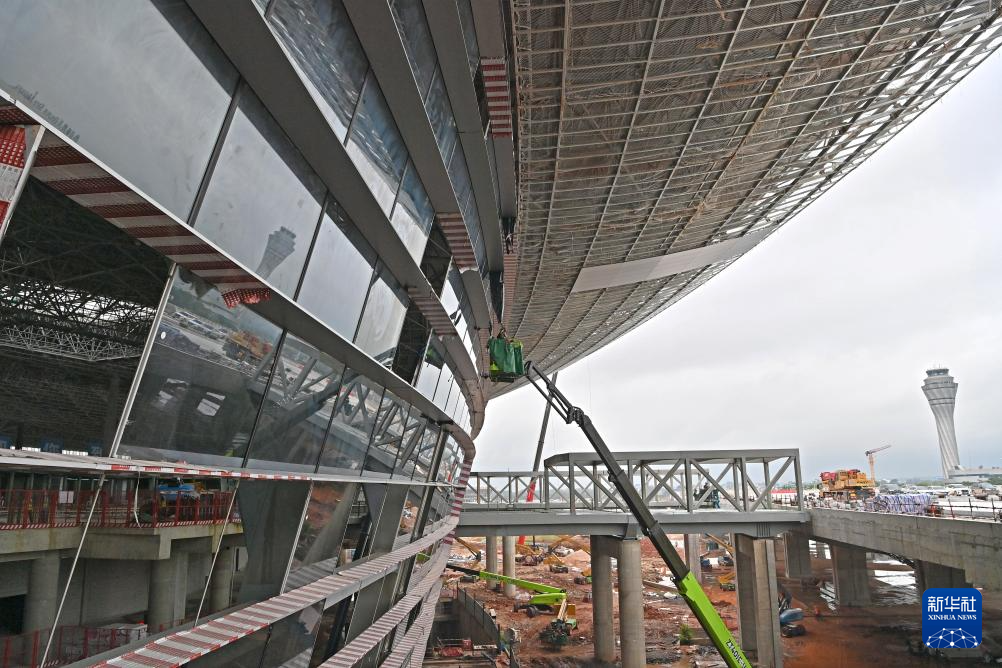 10月15日,中建二局的建设者在南宁吴圩国际机场T3航站楼二标段揭去玻璃幕墙钢构上的塑料膜。