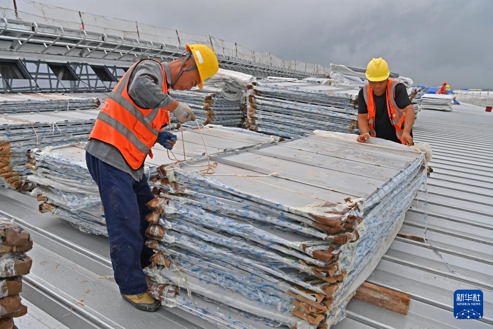 10月15日,中建二局的建设者在南宁吴圩国际机场T3航站楼二标段金属屋面上捆扎檐口盖板。
