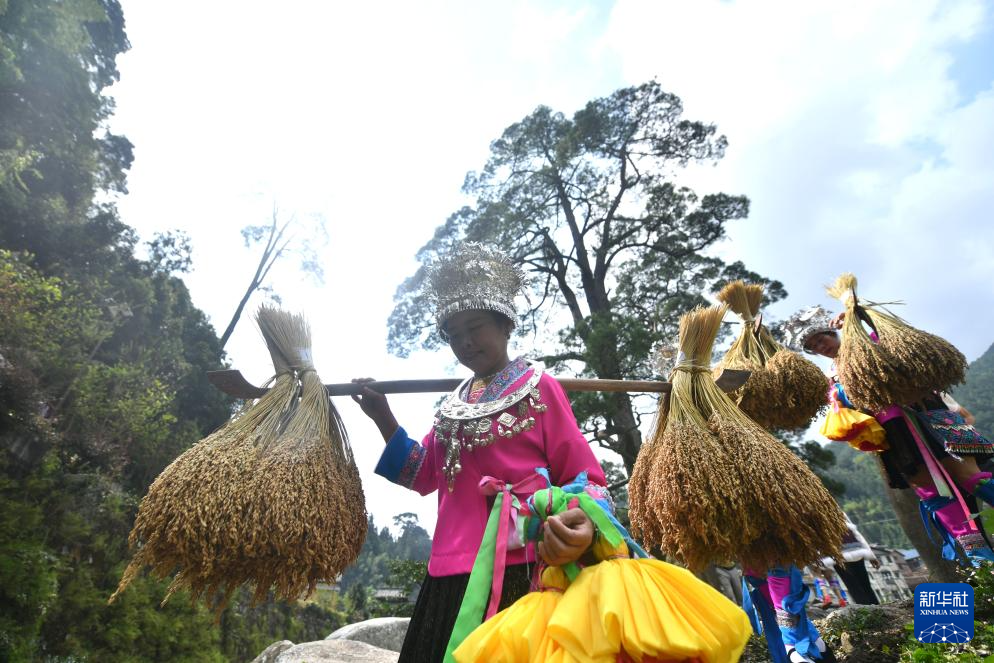 在广西柳州市融水苗族自治县安太乡培秀村,村民们在树下向游客展示稻鱼文化(2025年10月18日摄)。