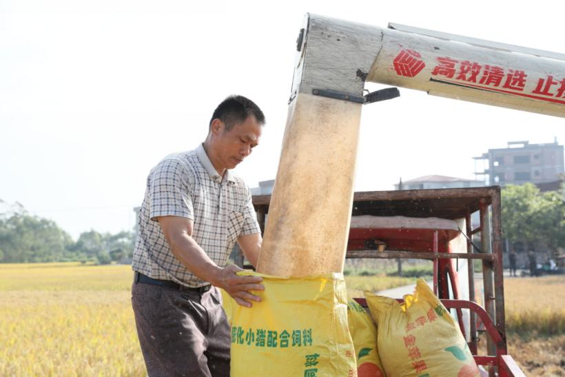 在容县容西镇思传村的稻田里,成熟的晚稻颗粒饱满,沉甸甸的稻穗压弯了稻秆。多台收割机开足马力,在金色的稻浪间来回穿梭。伴随着隆隆的机器轰鸣声,成熟的水稻被快速收割,脱粒、除秸、稻谷入仓,一系列工序一气呵成。田埂上,村民们忙着装袋、搬运,脸上洋溢着丰收的喜悦。“今年我的晚稻亩产有700多斤,雇用收割机帮忙收割水稻,看着谷子装进袋,心里很踏实。”该村村民甘丽说。据了解,容县晚稻收割机械化率超95%,原本需要多人耗时数日的收割任务,如今单日即可完成整片稻田采收,减少人力投入,保障秋粮颗粒归仓。