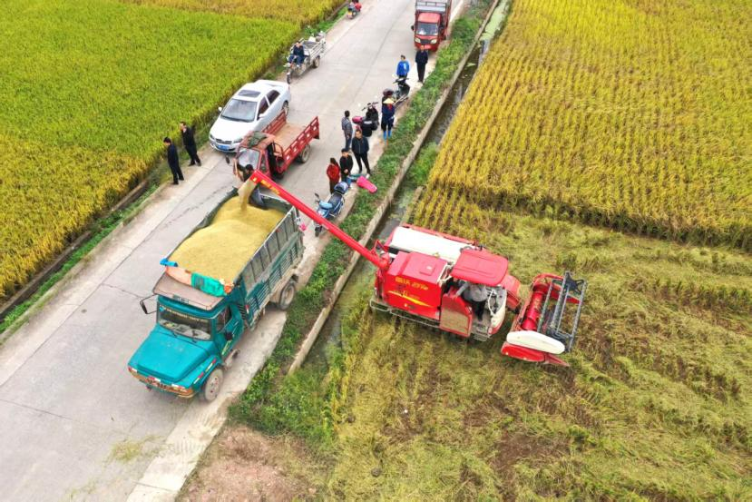 在官成镇双马村,收割机穿梭稻田之间,伴随着轰鸣的引擎声,收割,脱粒、清选一气呵成,一幅丰收画卷正在徐徐展开。