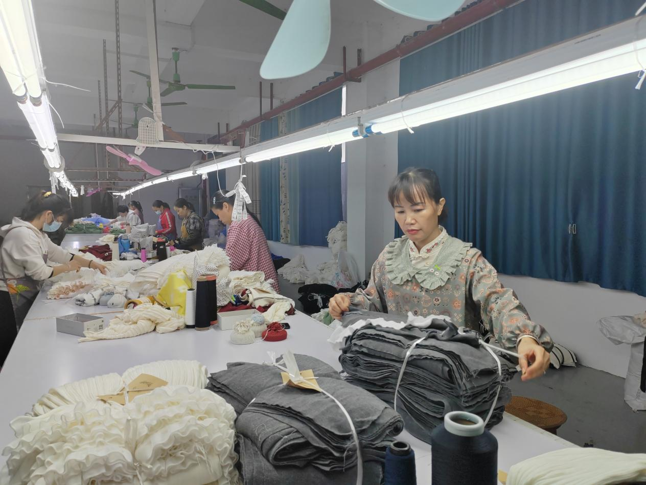 玉商回归新仲村小微产业园博白县天星服饰有限公司职工在进行衣片质检。