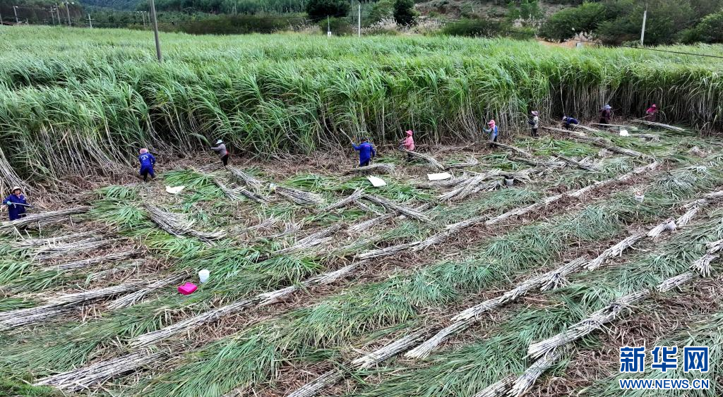 11月18日,在广西壮族自治区柳州市柳城县龙头镇,蔗农在地里砍收甘蔗(无人机照片)。