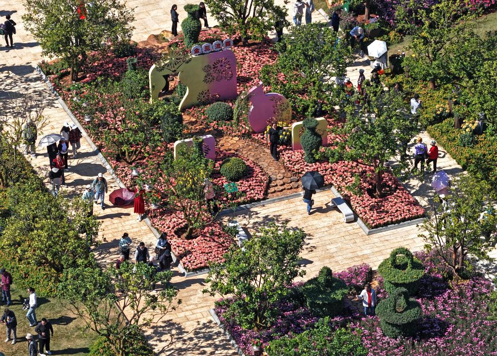 11月22日,市民在广西南宁市青秀山风景区欣赏菊花(无人机照片)。